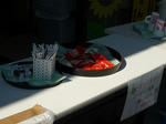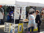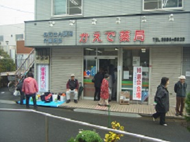 かえで薬局の方は、当初の予定では診療所横の公園を大きく使って舞台を用意して出し物もいくつも予定されていたのですが、朝があいにくの雨模様、当初の予定より規模を縮小して、舞台は診療所の待合室・福引やバザーは薬局の待合室に移動、ビニールシートを屋根代わりにしての屋台。狭いながらも組合員さんを中心に盛り上がりました。その活気に押されたのか天気も徐々に回復。こちらでは、職員は組合員さんに混ざって運営のお手伝い。会計や福引の受付として活躍しました。