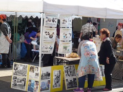 かえで薬局の方は、当初の予定では診療所横の公園を大きく使って舞台を用意して出し物もいくつも予定されていたのですが、朝があいにくの雨模様、当初の予定より規模を縮小して、舞台は診療所の待合室・福引やバザーは薬局の待合室に移動、ビニールシートを屋根代わりにしての屋台。狭いながらも組合員さんを中心に盛り上がりました。その活気に押されたのか天気も徐々に回復。こちらでは、職員は組合員さんに混ざって運営のお手伝い。会計や福引の受付として活躍しました。