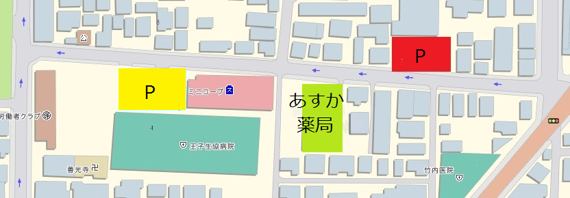 王子生協病院受診の方は、タイムズをご利用ください。王子生協病院の1時間無料券と当薬局のサービス券で2時間とめられるようになります。