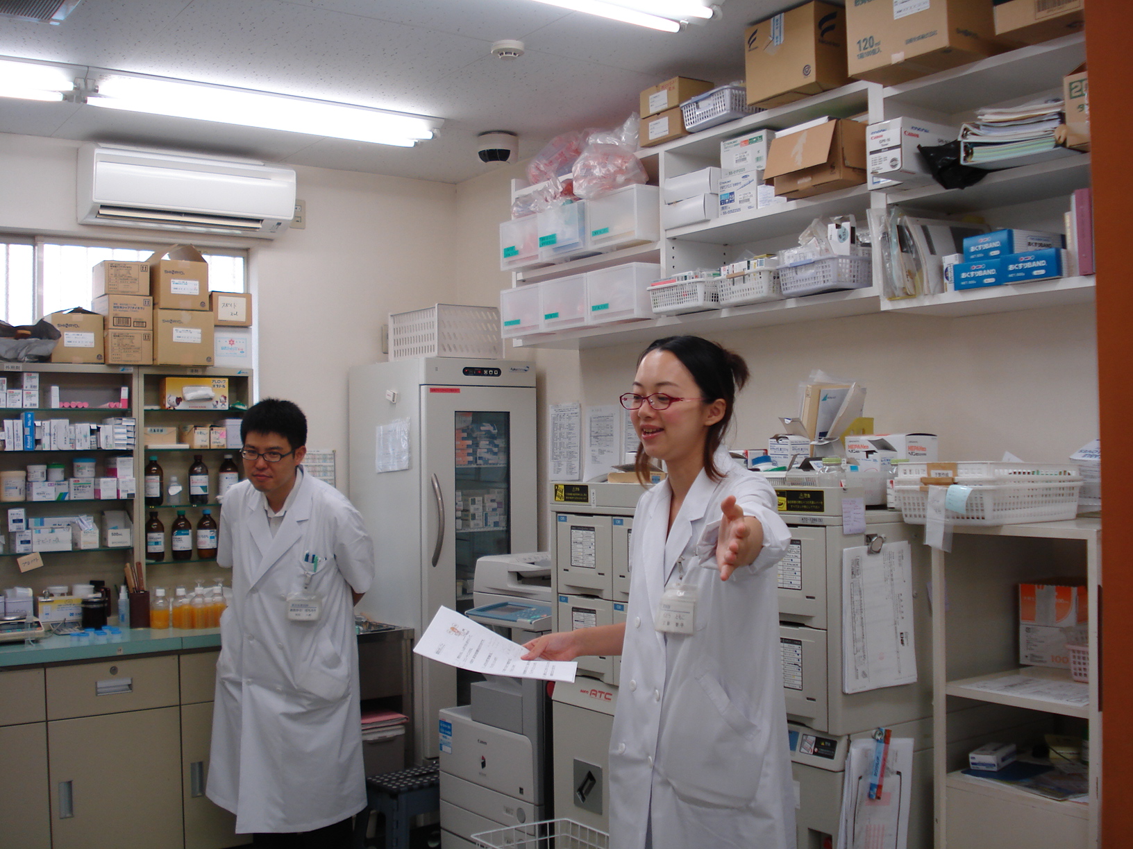 薬剤師さんがこども達に薬局でのお仕事を話している場面です。